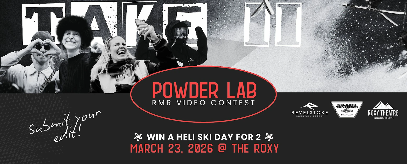 Share your idea, gather your crew, and register below to join the Powder Lab! Teams of max 2 people can submit an edit for a shot at winning a heli-ski day with Selkirk Tangiers Heli Skiing on March 25, 2026.